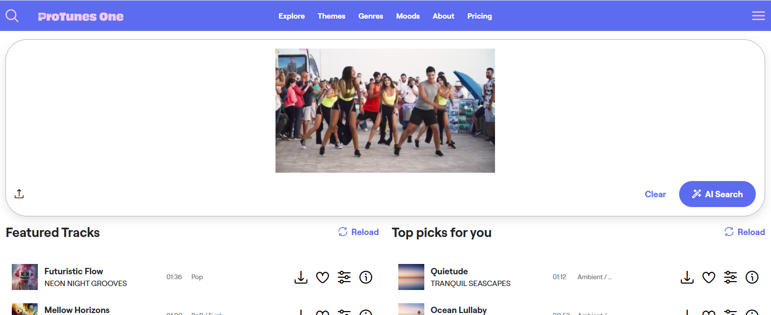 Alternatively simply upload your video, still image, or audio file and get music recommendations right away: